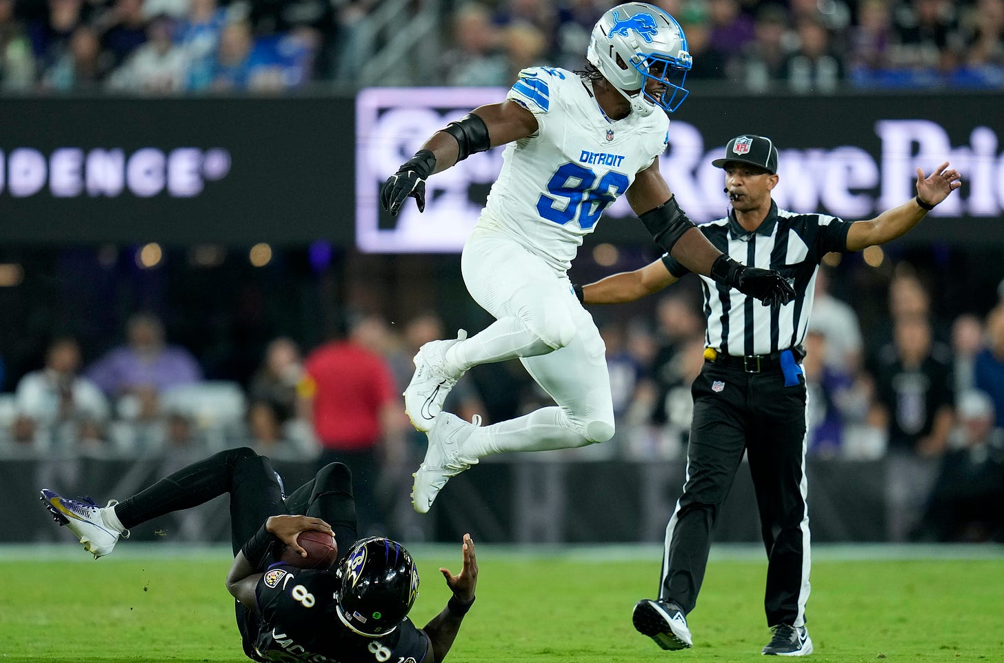 On one second-and-goal play at Baltimore, all that was missing was the ominous piano. Muhammad went full Michael Myers in tomahawking his arms through left tackle Ronnie Stanley to gain the edge and chase down quarterback Lamar Jackson from the blind side for a sack. Next, from the other side, he discarded a tight end to stare down the QB mano a mano — a predicament that typically doesn’t end well for defenders. Muhammad didn’t fall for any trickery in wrapping up Jackson for Sack No. 2. And then his play of the night came with less than 5 minutes to go and Detroit clinging to a 31-24 lead. On third and 12, it appears Muhammad’s been washed out of the play as Jackson steps up into the pocket with nothing but green grass in front of him.