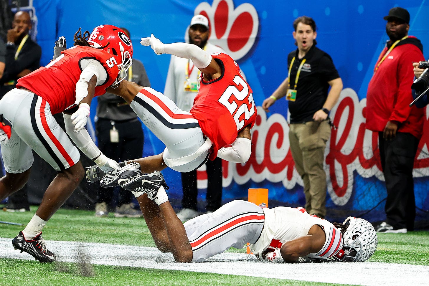 In the 2022 College Football Playoff semifinals, Georgia’s season was on life support. Forty-three seconds remained in the third quarter and Ohio State led, 35-24, with the ball at the Bulldogs’ 7-yard line. It was third and goal. Facing an all-out blitz, quarterback C.J. Stroud faded right and lobbed a high-arching prayer to Harrison in the back of the end zone. Bull (again) saw red. Bull (again) blasted through the wide receiver. This vicious crashing sound is accompanied by an echo, a chilling “Ooooo!” by all eyewitnesses as if witnessing a Talladega crash. One teammate rushes over to an immobile Harrison. Flags fly. Bullard — initially — is penalized for targeting, which means an automatic ejection.