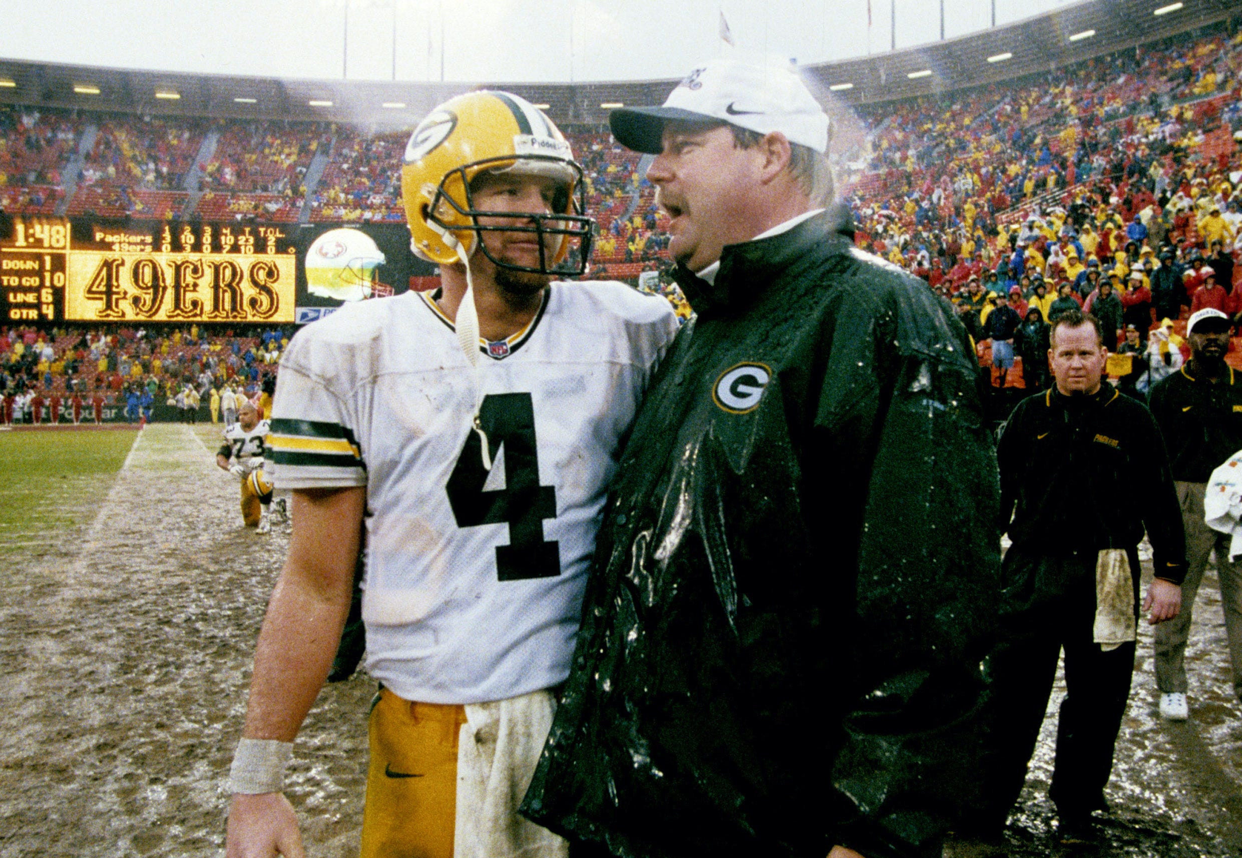 Initially, Holmgren called plays that worked when he was a 49ers assistant. If it was a five-yard hitch and throw, Favre might’ve dropped seven steps and bailed because he didn’t trust the protection. But Holmgren, a man who did not lack ego, never forced Favre to become his own cookie-cutter vision of a quarterback. “So rather than say, ‘Look here, you son of a bitch, you better trust the protection,’” recalled Favre. “He said, ‘I’ll call plays that’ll get him on the move. We’re going to go play-action, we’re going to go bootleg where he’s not thinking too much. And as he progresses in the offense, I can expand a little bit.’ And it worked to perfection. I didn’t think. I just reacted.”