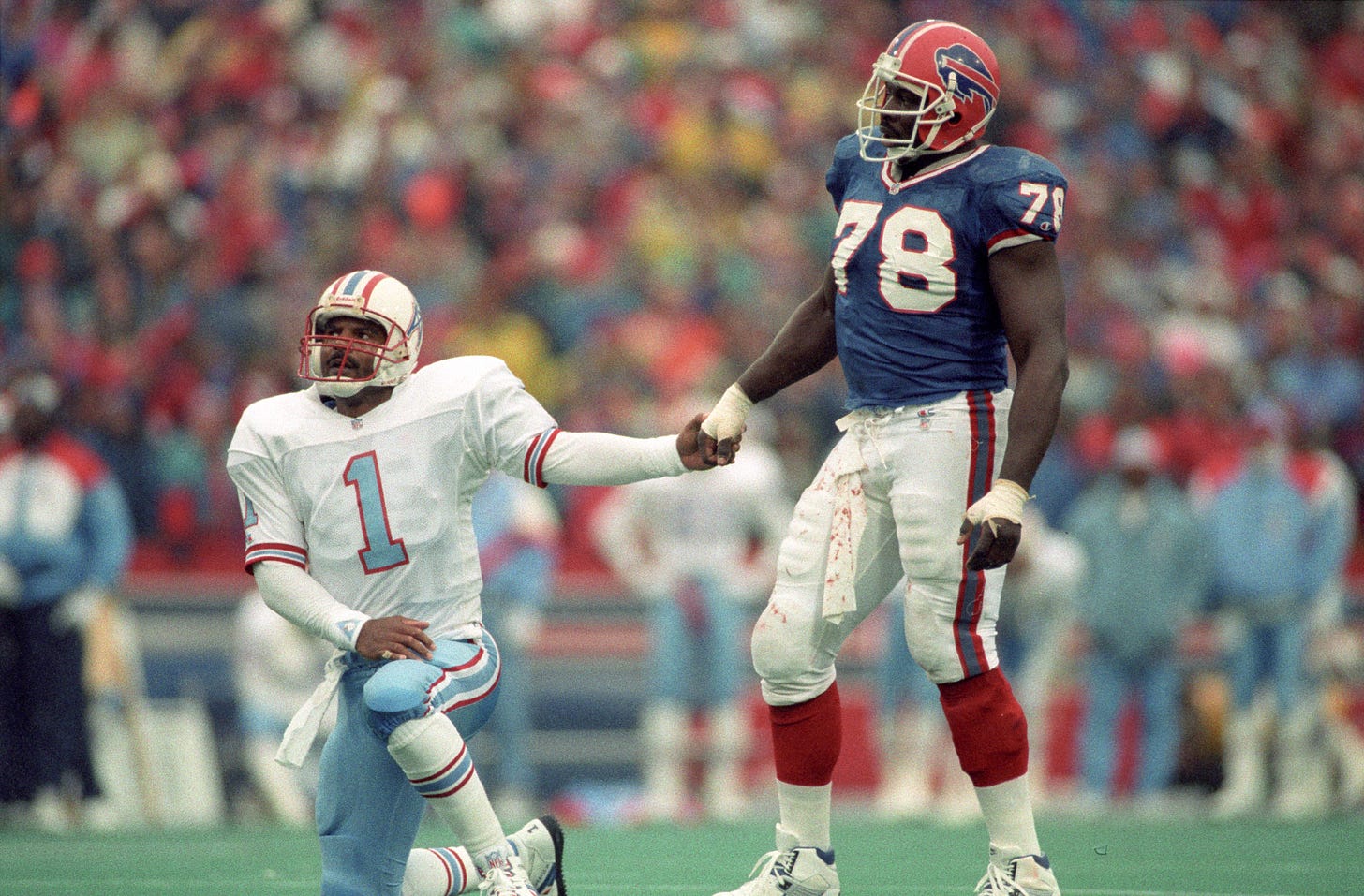 Dunne: Five years, $6 million with the Houston Oilers. That’s the richest contract at that time. So you get paid. A team believes in you. You’re the franchise guy. But what is that first game like? You need to still — like you said earlier — prove it to yourself and know, “OK, I’ve been dominating every field I’ve been on, but now I’m in the NFL.” Was there a throw, a moment where things kind of clicked and you said, “OK, I’m going to be able to do this here with these guys?”