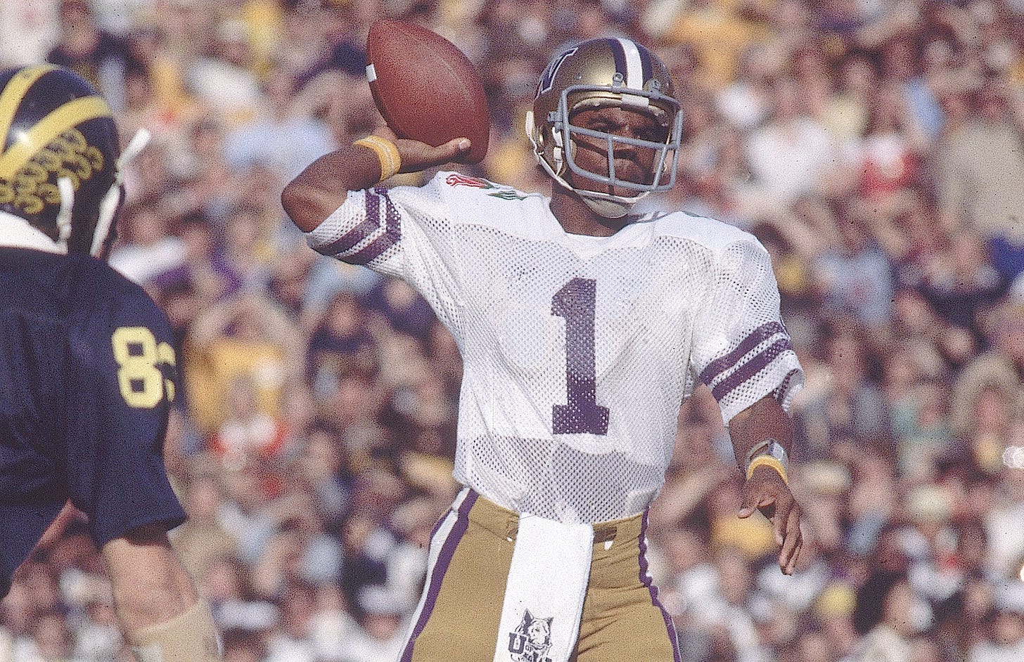 Dunne: Take me back to 1975. That’s when you went to Washington. We’ve talked a lot about the old war stories from pro football on one of our Zoom Happy Hours a couple of years ago, but I don’t think we really got into your origin story and how you really rose up at UW, CFL, NFL. But in 1975, you go out there to Seattle. That was a leap of faith at that time and it didn’t really hit me what the Seattle sports scene is like then, right? The Mariners and the Seahawks are just being born. The SuperSonics hadn’t won a championship yet. It’s rainy. It’s dreary. And Warren Moon decides to go out there to play college ball. That decision, you probably know at that point you’re attempting to do something that nobody’s really done in terms of being a star quarterback that’s an African American. James Harris was before you, and I’m sure he was an inspiration in many regards. But the decision to go to Washington first, what went into it?
